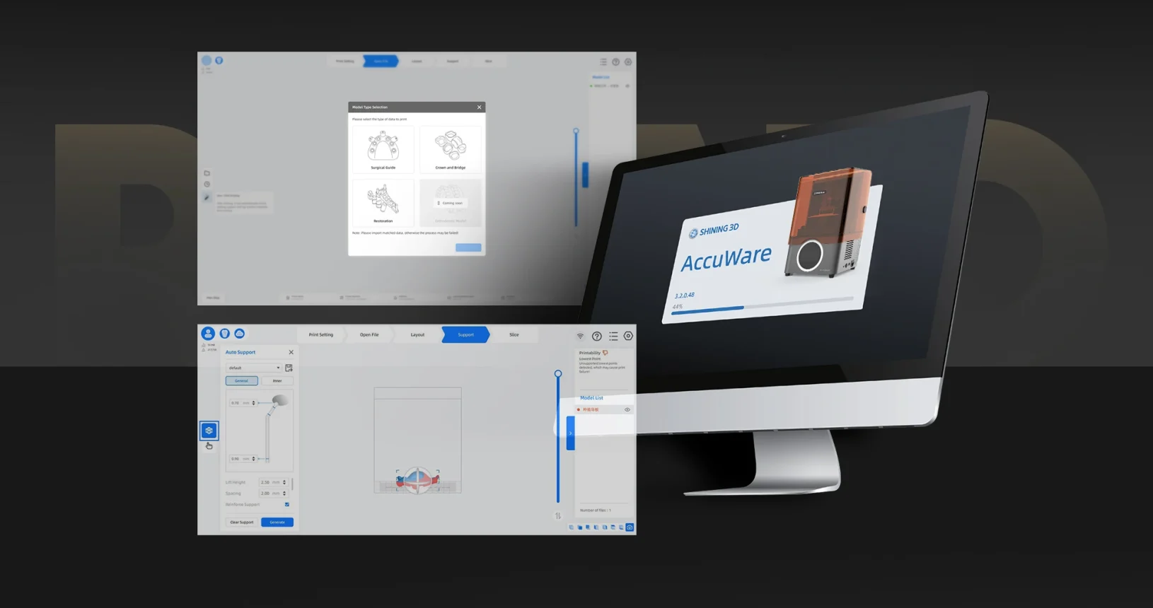 AccuWare / Shining 3D Print Software: نرمافزار اصلی کنترل پرینت با امکانات Auto-Support و تنظیم ضخامت لایهها.
